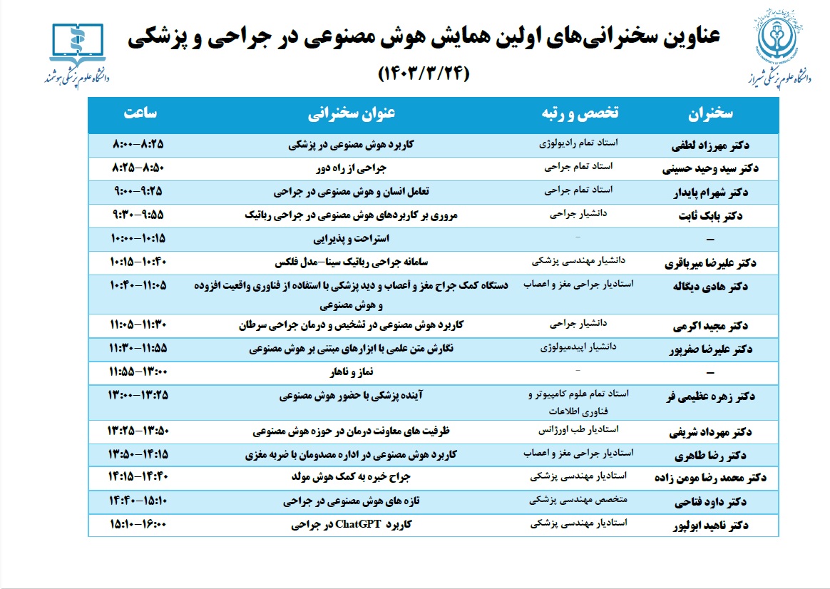 دانشگاه علوم پزشکی شیراز در نظر دارد همایش کشوری هوش مصنوعی با عنوان "هوش مصنوعی در جراحی پزشکی "برگزار کند