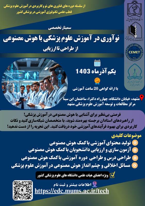 با هدف ارتقاء توانمندیهای اعضای محترم هیأت علمی دانشگاه/دانشکدههای علوم پزشکی کشور در زمینه فناوریهای نو و متناسب با روند روز در آموزش علوم پزشکی، دانشگاه علوم پزشکی مشهد با همکاری مرکز مطالعات و توسعه آموزش علوم پزشکی مشهد، قطب علمی تکنولوژی آموزشی در پزشکی کشور و هسته تحقیقاتی آموزش علوم پزشکی مشهد در نظر دارد سمینار تخصصی «نوآوری در آموزش علوم پزشکی با هوش مصنوعی، از طراحی تا ارزیابی» از سلسله دورههای آموزشی فناوری های نو و کاربردی در آموزش پزشکی را برگزار نماید. این سمینار یکروزه به صورت حضوری در دانشگاه علوم پزشکی مشهد، فرصتی استثنایی برای یادگیری و تبادل نظر در زمینه آموزش به کمک هوش مصنوعی با همکاری مجموعه ای ارزشمند از اساتید برجسته و تسهیل گران آموزش دیده کشوری و معادل با 20 ساعت آموزشی خواهد بود.