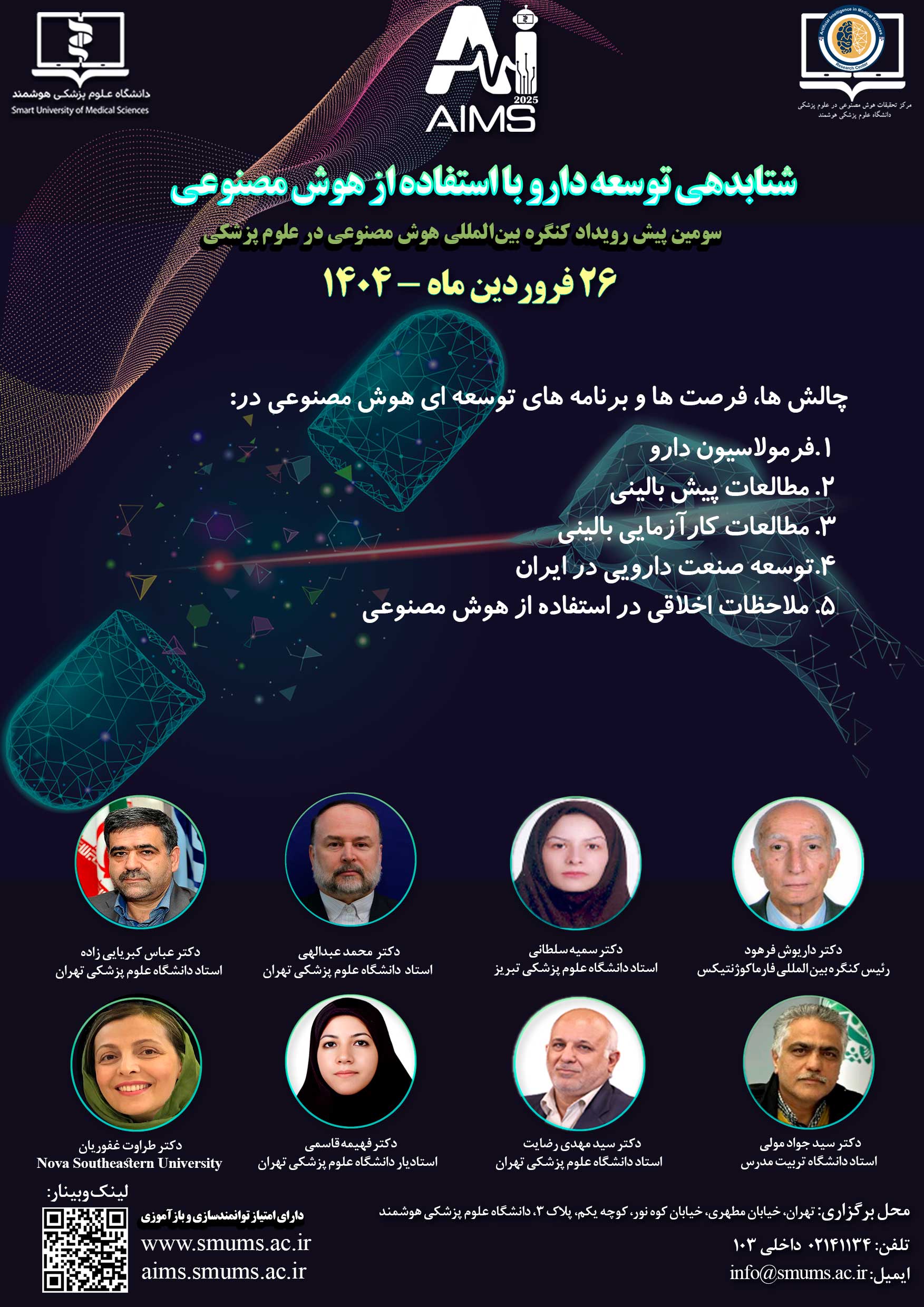 پیش رویداد شتابدهی توسعه دارو با استفاده از هوش مصنوعی در تاریخ 26 فروردین ماه 1404 بصورت مجازی و حضوری در سالن کنفرانس دانشگاه علوم پزشکی هوشمند برگزار خواهد شد